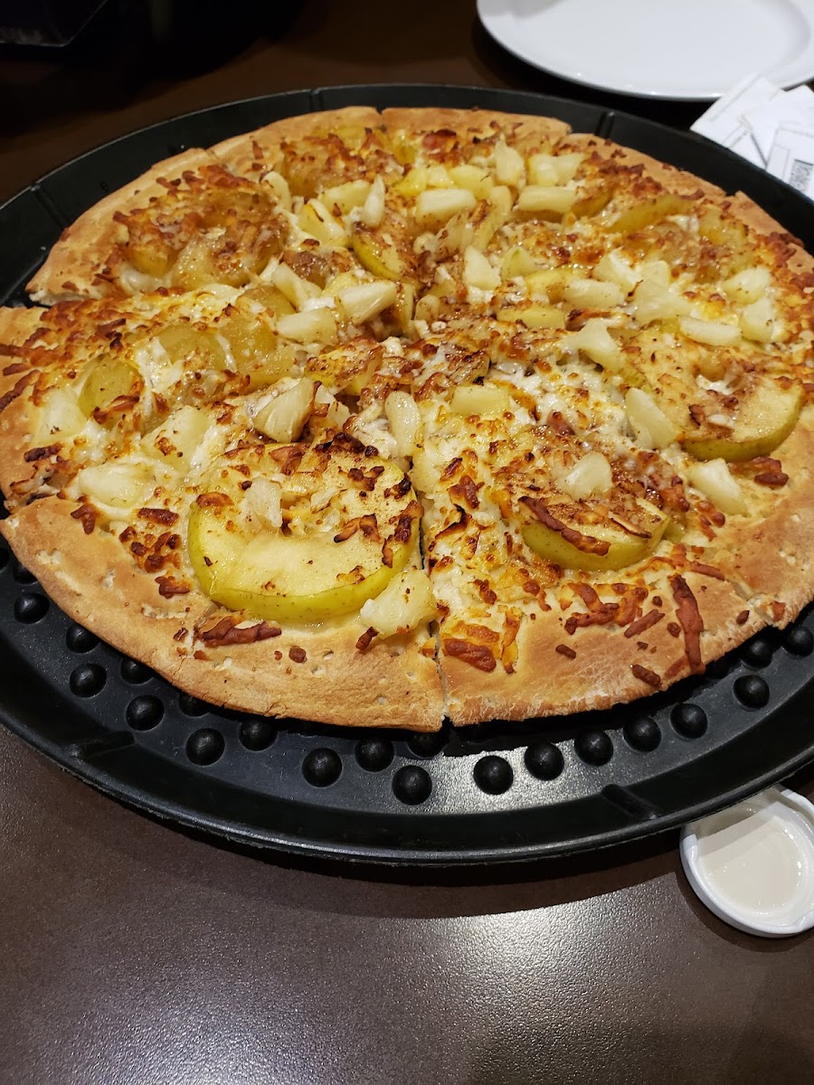 We came to this location bc their other location we were going to go to was closed. Thin crust pizza but flaky not hard. We ate regular pepperoni for the kids a Mexican pizza and an apple cinnamon Pizza. I love that they had a spot for the kids to go and play while the pizzas being made.